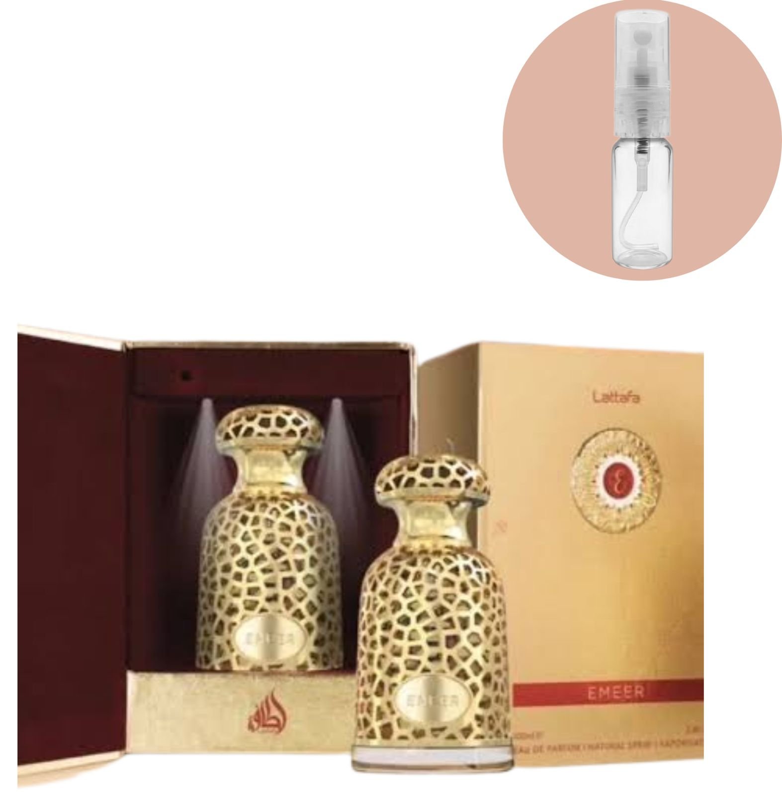 Emeer da Lattafa é uma fragrância que exala luxo e mistério. Seu frasco trabalhado em dourado, com design vazado de inspiração árabe, remete à sofisticação dos perfumes do Oriente Médio.